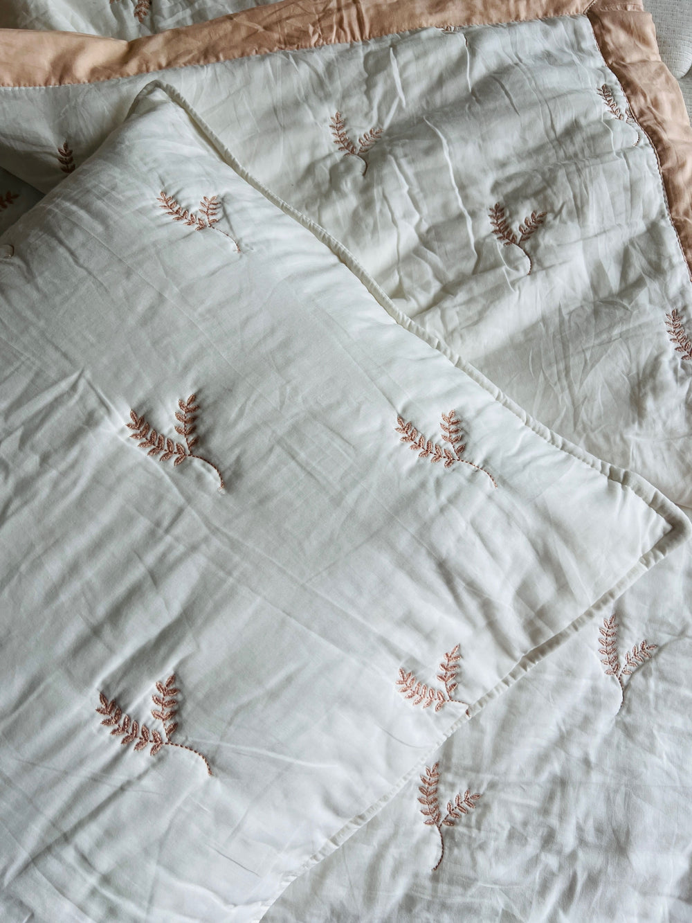 Our Embroidered quilts/bedcover sets are made with highest quality fabrics and filling. Made with mulmul and filled with organic cotton, these embroidered beauties are soft, cozy and great for year round use.