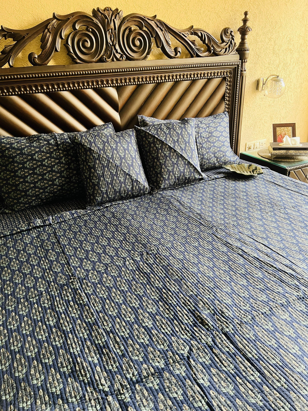 Elevate your bedroom into a royal sanctuary with the Fanfare Signature Quilted Bedcover. Meticulously handcrafted using age-old Indian traditions, this piece is more than just bedding—it is a work of art. The intricate handblock patterns create a visual symphony, while the plush, breathable texture invites you to unwind in absolute luxury. Perfect for adding a touch of regal elegance to your modern home.
