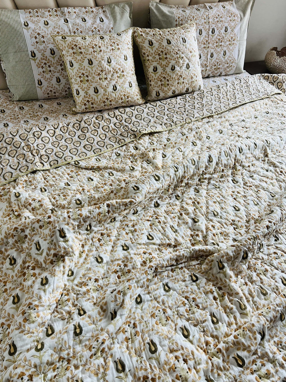 Elevate your bedroom into a royal sanctuary with the Fanfare Signature Quilted Bedcover. Meticulously handcrafted using age-old Indian traditions, this piece is more than just bedding—it is a work of art. The intricate handblock patterns create a visual symphony, while the plush, breathable texture invites you to unwind in absolute luxury. Perfect for adding a touch of regal elegance to your modern home.